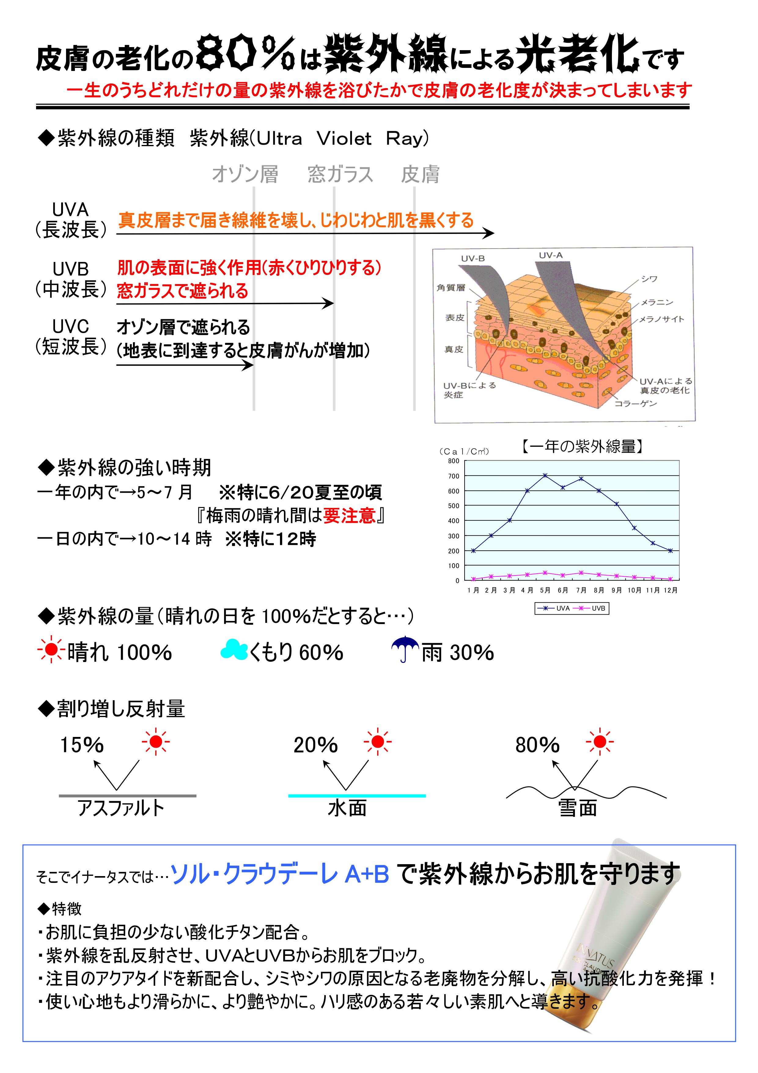 市販の日焼け止めクリームは、UV-Bに対応するSPF数値ばかりが強調されて表記してあります。この数値が高いだけで紫外線を防御する効果が高いと錯覚されがちですが、紫外線にはシミ、ソバカスの原因となるB波(UV-B)と、黒皮化やシワの原因になるA波(UV-A)があります。日焼け止めは、UV-Bだけでなく、UB-AをブロックするPA効果のあるものも、選ぶ必要があります。